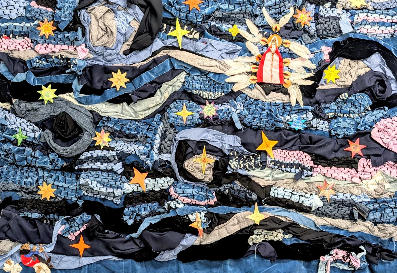 We’d like to thank everyone who used a cardboard loom, wool and recycled fabric to make a section. It has made a beautiful background to tell of Saint Aidan going into heaven surrounded by angels, watched by Saint Cuthbert. See if you can spot Cuthbert and his sheep, Aidan and the angels, and perhaps your own contribution!