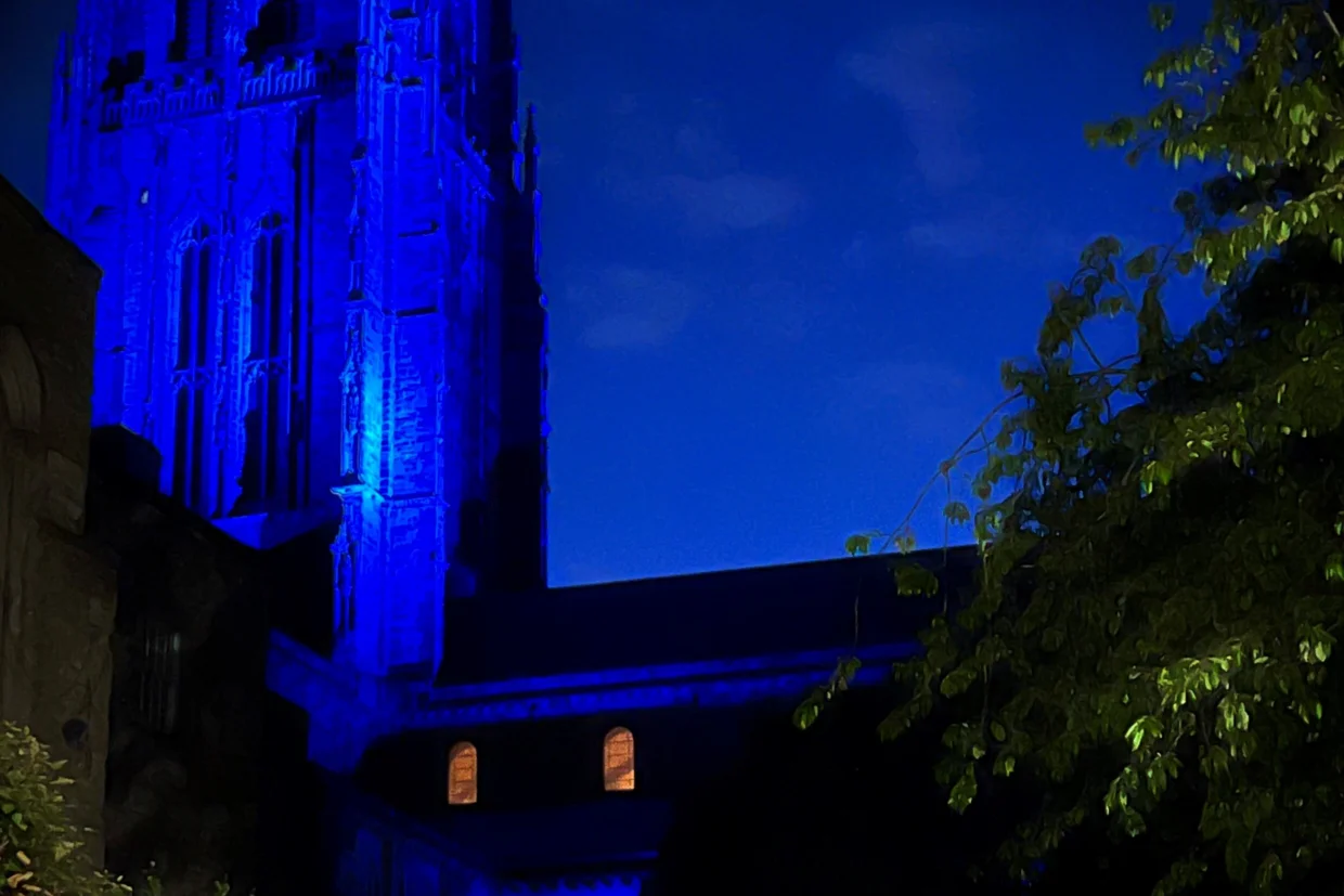 To mark Dementia Awareness week, the cathedral was lit in blue from dusk and formed part of a trail of blue buildings in and around the city. Organised by the local Alzheimer’s Society the blue buildings included the cathedral, Durham Castle, Dilston Physic Garden, Hatfield College, Durham University Oriental Museum and Durham Botanic Garden